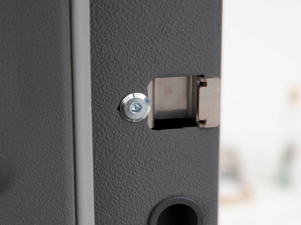 Дверь оснащена двумя независимыми системами запирания. Верхний замок сейфовый, ключ типа бабочка. Нижний замок цилиндровый с бронированной накладкой - защитой от высверливания и выбивания сердцевины.